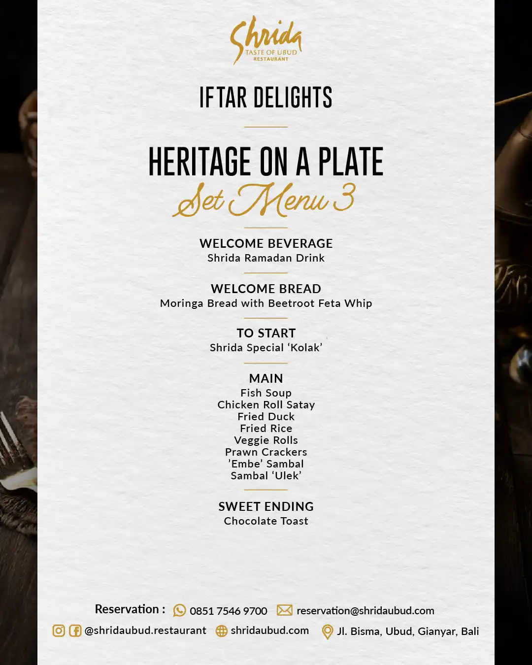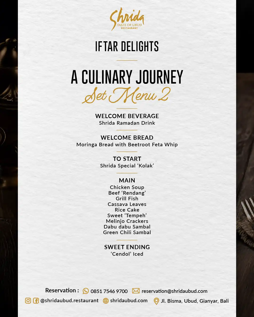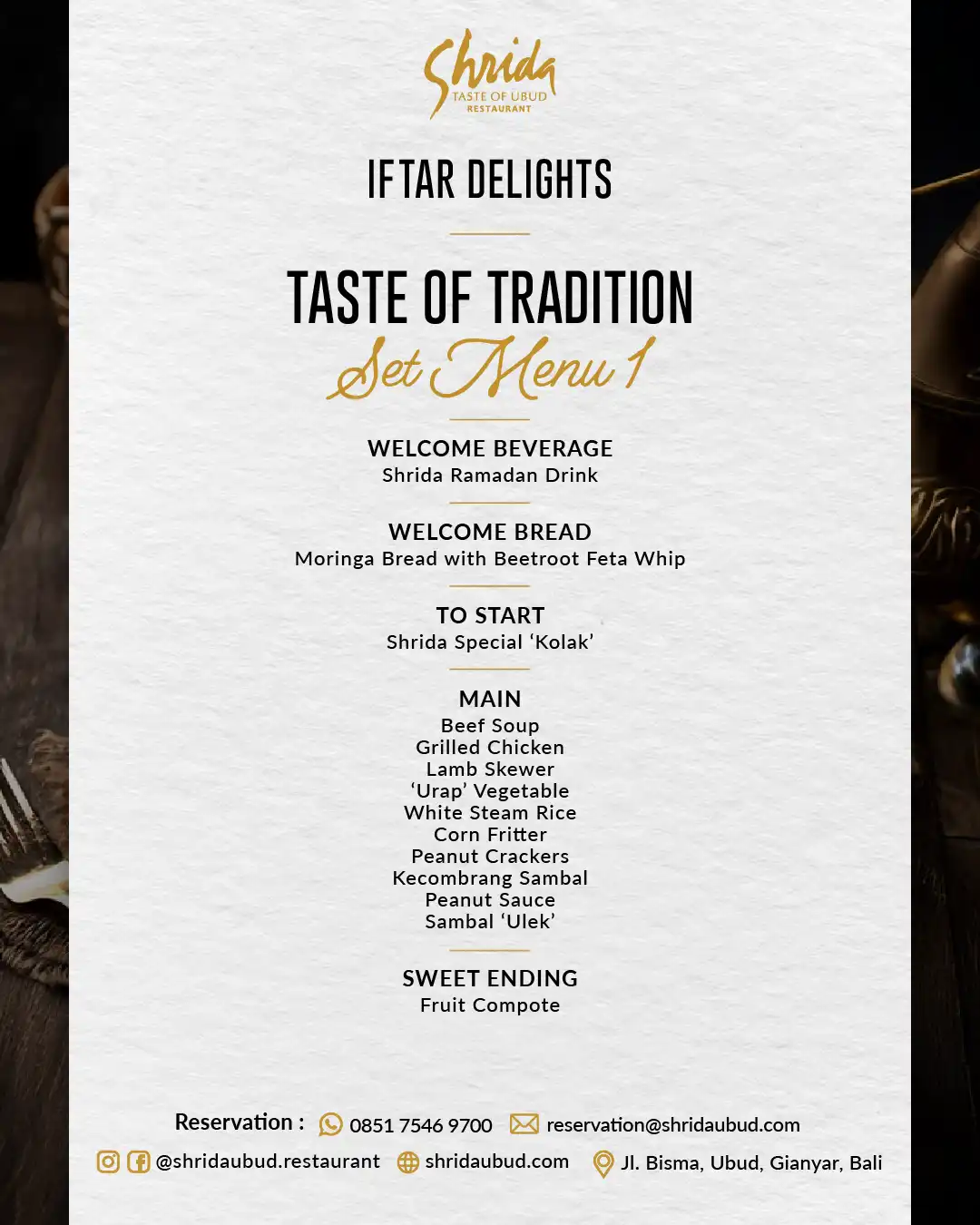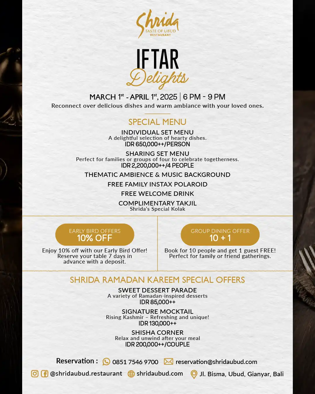 Join us at Shrida Taste of Ubud Restaurant throughout the month of Ramadan, from 18:00 to 21:00, and immerse yourself in an unforgettable Iftar celebration. For more details and reservations, please contact us via WhatsApp at +62 851 7546 9700 or email [email protected] more information, please visit our website at www.shridaubud.com or contact us directly at WhatsApp +62 851-7546-9700 or email [email protected]