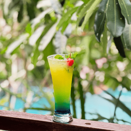 - Ocean Blue: Refreshing blue curacao syrup with orange juice, pineapple juice, and lemon juice.